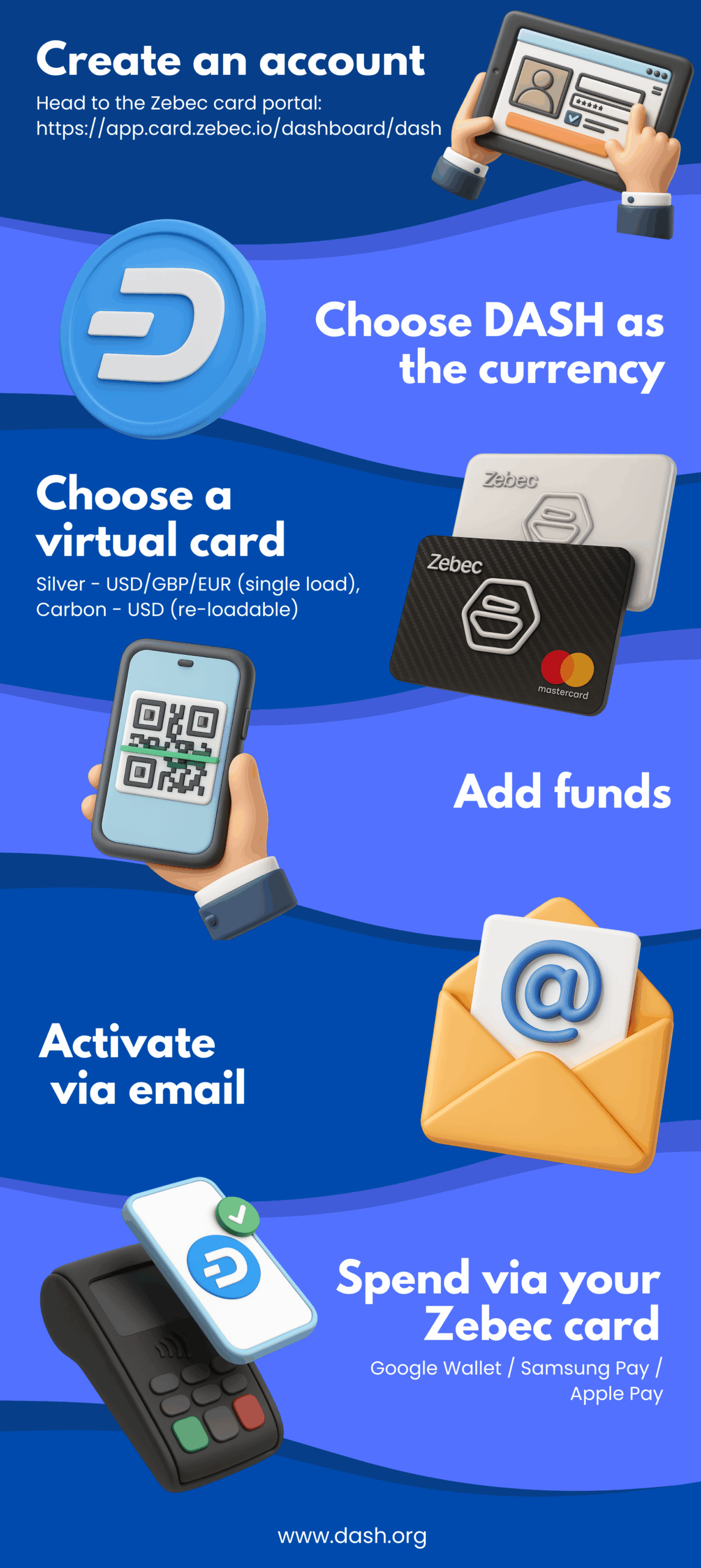 We’re working with Zebec on another card as well: a high-limit, Dash-branded virtual card. While this will require ID verification, its high limits will mean it’s perfect for buying even high-end items. And, it will be offered in USD and EUR, so our European users will finally have a reloadable Dash card! This will hopefully be released before the end of the year, so stay tuned for a future announcement.Additionally, we are exploring working with Zebec on tools that extend past cards, and solve other crucial gaps in the global financial ecosystem. We will, of course, announce these as they are finalized.Dash is committed to being decentralized money for the world: everyone everywhere deserves access to the very best the digital financial world has to offer. Thanks to Zebec for partnering with us to help make this dream a reality!